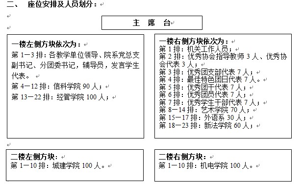 3.请各系指定以下人员于5月13日中午12:30分到达模拟法庭,进行彩排:每个院系5名学生代表领奖(优秀团支部、最佳特色团日、优秀团干、优秀团员、优秀学生干部)。