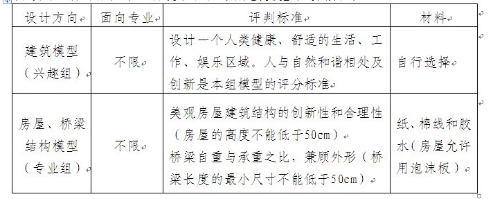建筑模型设计组、桥梁结构模型设计组、房屋结构模型设计组各设一、二、三等奖各一名。同时设单项奖最佳造型奖、最佳制作奖、最佳创新奖若干。