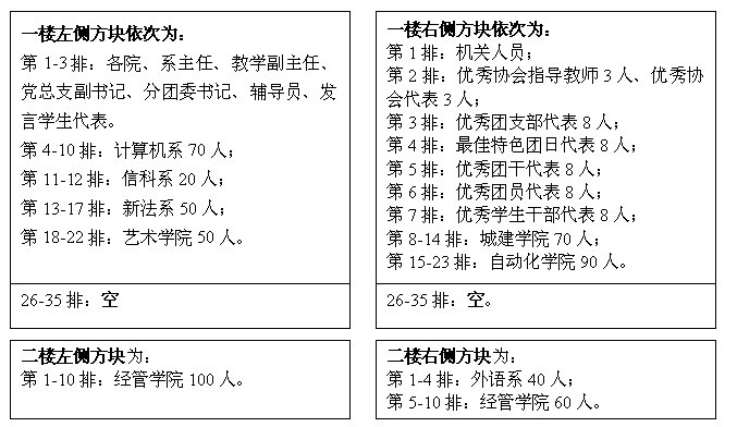 邀请各院、系主任、教学副主任参加,全体学生管理人员,获奖学生及学生代表参加。2:50分进场完毕。