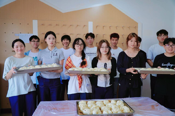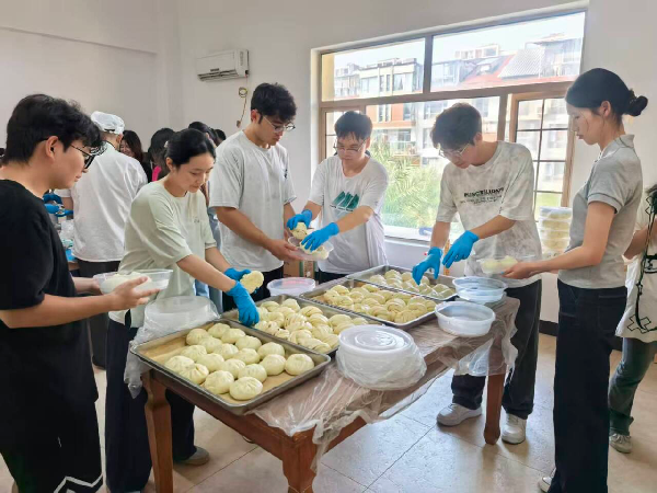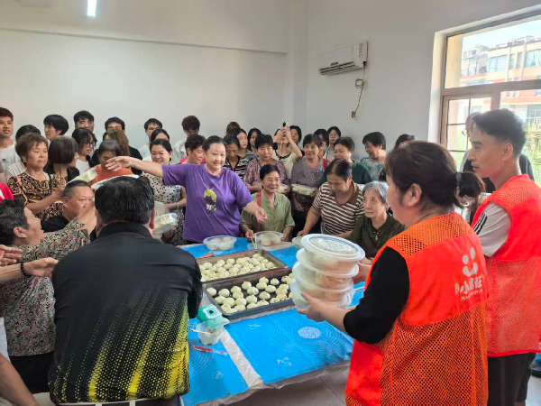 随着准备工作完成,“社区厨房”正式开启。面点师傅手把手教学,从面团的软硬调节,到擀皮时如何保持圆形,再到填馅后捏出均匀的褶子,每一步都讲解得细致入微。志愿者们围在师傅身边,眼神专注,手上反复练习,有的同学因力道控制不好,擀出的面皮厚薄不均;有的同学则在捏褶时总让馅料“露出来”,但在师傅的耐心纠正和同伴间的互相支招下,一个个形态虽不完美、却满含心意的包子渐渐成形。当面香弥漫整个活动室时,饱含着志愿者们辛勤劳动成果的面点新鲜出炉。同学们小心翼翼地将花卷和包子分发给早已等候在旁的社区老人们。接过这份热气腾腾的“心意”,老人们的脸上露出了开心的笑容。在这温馨的时刻,所有志愿者与老人们聚集在一起,拍摄了一张洋溢着幸福与成就感的“全家福”,将这份美好的记忆永久珍藏。