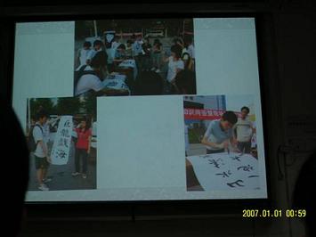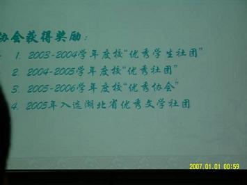 首先,展现的是一幕幕影像。展示的是书法协会的优秀作品和协会的简介,会歌等。正当我们为这些优秀作品所沉醉是,副会长充满充满激情的话语响起:“欢迎新会员!”教室里顿时响起一阵热烈的掌声,副会长接着向我们介绍书法协会,该协会自成立以来连续三年被评为校优秀团体,2006年被评为湖北省优秀文学类学生团体,在学校举行的活动中多次获得奖项,并多次代表我校参加全国及各地方的比赛获得优异成绩。协会以弘扬民族优秀文化,全面提高学生书法修养为宗旨,多系举办书法比赛,取得了不错的效果。介绍完协会,会长又具体向新会员讲解活动的安排,安排会员们每周一到周四到大学生活动中心的活动室学习书法,又强调了活动室的注意事项,要求会员们能做到爱护、维护、节约和服从管理四点,共同创造学习书法的优秀环境。讲话完毕,邀请新闻传播系书法老师给会员们讲话。