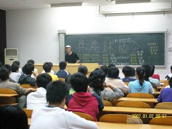 2008年10月10日晚上19:00在乒乓球协会副会长郑李浩的主持下于11栋107召开了乒乓球协会新生交流大会。 大会上首先由乒乓球协会副会长郑李浩发表了讲话,他着重介绍了乒乓球协会的结构组成及其发展史。华中科技大学武昌分校乒乓球协会是由校团委领导,在全体乒乓球爱好者的共同努力下于2002成立的。协会共有七个部门:办公室,组织部,宣传部,技术部,策划部,裁判部,财政部,各项事务都由它们统筹管理且分工明确。 自本协会成立以来,不断有新的成员加入,让协会不断发展壮大。为提高广大乒乓球爱好者的技艺,协会聘请了技术顾问并且于每周六下午14:00~17:00在北区体育馆内进行指导训练。协会为广大乒乓球爱好者提供了广阔的舞台,不仅可以和老会员之间进行球技的交流,还可以与其他兄弟学校的乒乓球爱好者进行比赛交流。 接着在副会长郑李浩的提议下进行了新成员副部长竞选演讲。新成员们踊跃参加竞选,现场气氛很是活跃。作为乒乓球协会的新成员,刚刚迈入大学的大一新生,站在这个竞选演讲的舞台,虽然他们表现的有些拘谨,但他们的脸上都洋溢着自信的微笑。从他们自信的微笑中我们看到了乒乓球协会更加美好的未来。 加油吧!国球的光荣,与你我同在!
