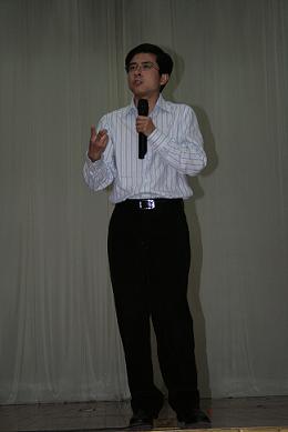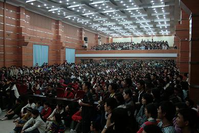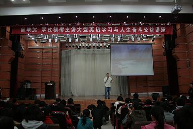 武汉新东方学校校长,武汉大学跨文化传播学博士生、“英伦绅士”李杜 11月8日晚上,应我校团委的邀请新东方董事长、创始人、“留学教父”俞敏洪以及武汉新东方学校校长,武汉大学跨文化传播学博士生、“英伦绅士”李杜来我校开展了一场“英语学习与人生励志”的大型讲座。我校模拟法庭全场爆满,近2000名学生聆听了讲座。 俞老师结合自身经历,富于幽默感和激情的给同学们讲述了人生励志方面的话题。他说,大学四年,我们应该收获三种最重要的东西——知识,友谊和爱情。 他从自己学习英语的困顿到后来开创英语教育领域内词汇速记先河的亲身经历告诉同学们,年轻人一定要选择一项自己热爱和有兴趣的学科,在这个学科里一定要做到尽量出色,这样,你才有真正的专业技能,你的兴趣才会成为真正的人生职业。他还用自己在大学中结交王强、徐小平等良师益友,以致后来变成共同开创新东方事业的创业战友的亲身经历,告诉同学们友谊的重要性。 谈到同学们感兴趣的爱情问题时,俞敏洪老师把自己的形象和婚姻的幸福进行了对比和割裂,“多少人曾经爱慕你年轻时的容颜,可是谁经的起岁月无情的变迁”全场观众为之报以热烈的欢呼。俞敏洪老师平缓而真挚的叙诉,诙谐幽默的自嘲,让学子们感受到了成功者的一种坦诚, 随后,李老师接过俞老师话筒以其纯正的英语发音很快带领大家融入了英语世界中。他带领同学们对自己的英语学习进行了一次全新的思考。阐释了如何学习英语和如何建立真正学好英语的信念。李老师指出“当你潜心下来学习英语的时候,你会深刻感受到英文的美,一种音韵美!”他号召同学们要“像学音乐那样学习英语并乐在其中”。优雅的风度 幽默的比喻、睿智的语言,如涓涓细流般悦耳清澈的口语令在场诸位同学如沐春风。