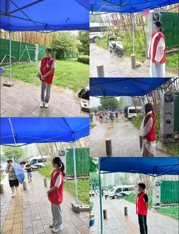 风雨无阻,志愿红点亮考场外。中考期间,武汉遭遇持续降雨天气,给考生出行带来不便。为保障考试顺利进行,新闻与文法学院10名志愿者与通惠社区提前部署,在考点周边搭建遮雨棚、设置引导岗,提供路线指引、心理安抚等服务。“早上7点我们就到岗了,雨势大的时候,鞋袜全湿透了,但看到考生们顺利进场,一切都值得。”汉语言专业志愿者周欣烨说道。三天时间里,志愿者们不辞辛苦,为等候的家长提供了临时避雨点和饮用水。