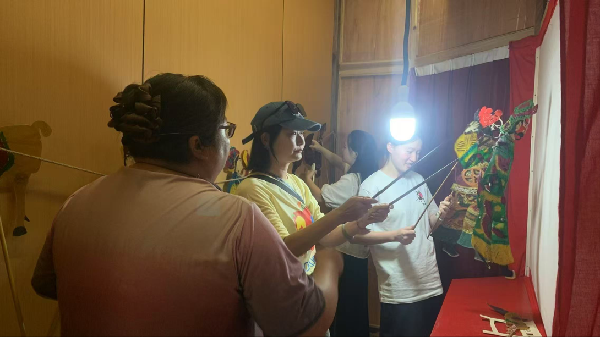 参观之后,师生们与当地非遗传承人展开了深度互动实践。在织锦工坊,学生们在传承人手把手的指导下,尝试操作古老的腰机,体验经纬交织间的匠心韵律;在皮影体验区,大家操控着质朴的皮影人偶,感受人偶提线在手掌延展的温度与挑动的乐趣。带队专业教师陈晓慧老师现场引导同学们思考:“这些蕴含深厚地域情感的纹饰符号、色彩体系和独特质感,如何转化为现代视觉传达的创新语言!”学生们纷纷拿出速写本,记录纹样细节,或运用专业软件尝试进行纹样提取与再设计,部分同学的设计草图还融入了现代生活元素,展现出传统与时尚碰撞的无限可能。此外,同学们在巴东非遗博物馆现场体验了皮影艺术。