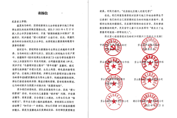 日前,我校新闻与文法学院“首梦天地”校企地乡村振兴工作站师生团队收到来自京山市罗店镇马岭村和企业单位的联名表扬信,信中高度评价团队用新媒体技术赋能乡村振兴的创新实践,向学校对马岭村乡村振兴工作的大力支持致以崇高敬意和衷心感谢。