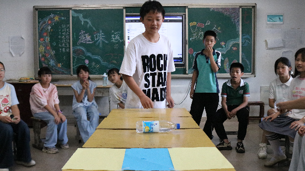 一至三年级的教室里,“方向盘挑战赛”正如火如荼。孩子们全神贯注,随着口令快速转向,“向左转!”偶尔有人转错方向,憨态可掬的笑容和同伴善意的笑声立刻充满教室,纠正后的小脸上则写满了得意的神采,尽显童真本色。四至五年级的“传话筒”游戏则成了欢乐的海洋。话语在接力传递中不断“变形”,传到最后的答案往往与原句大相径庭,引得阵阵欢笑。这个游戏不仅考验听力,更在无形之间拉近孩子们的距离。六年级的活动则更加具有挑战性。“击鼓传花”带来心跳加速的紧张与期待,花落谁家牵动着每个人的神经。而“桌面冰球”则成为智慧与技巧的较量,孩子们屏息凝神,或精准推杆,或巧妙防守,在小小的桌面上展开激烈的“角逐”。支教队员邓金艳在组织桌面冰球赛后表示:“输赢不重要,关键是在规则里学会坚持和尊重对手。”