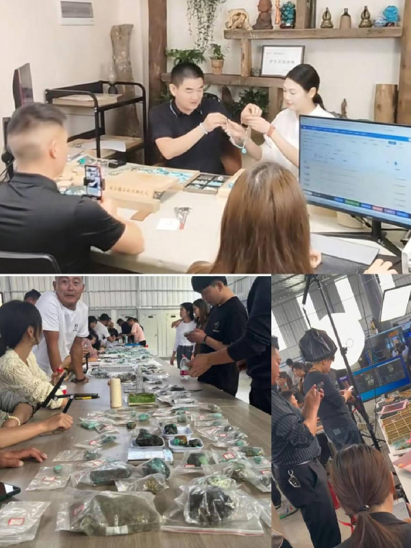 在新交易中心的直播带货区,团队看到商户们正对着镜头展示绿松石新品,弹幕互动热烈。与寒假调研时的抖音电商直播基地相比,新中心的直播模式更加成熟——不仅整合了抖音、快手等平台资源,还与小红书、bilibili等以年轻群体为主要受众的平台合作,推出“绿松石+国潮”、“绿松石+非遗”、“绿松石+联名”等主题直播,吸引了大量年轻消费者。