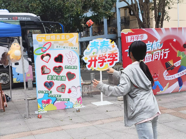 活动现场,医护人员与志愿者严格按照献血流程,有序引导同学们完成信息登记、健康检查、血液采集等环节,耐心解答同学们关于献血间隔、营养补充等疑问,确保献血过程安全、规范。随后,同学们挽起衣袖,鲜红的血液顺着导管流入血袋,一张张充满暖意的脸庞,成为校园里动人的风景。活动现场还设置了“烦恼丢丢乐”互动游戏,色彩缤纷的游戏板上,制作了“禁止蕉绿”“丢掉烦恼”等心形洞口,同学们手持沙包,瞄准自己选定的洞口投掷,在奉献爱心的同时为心灵解压。